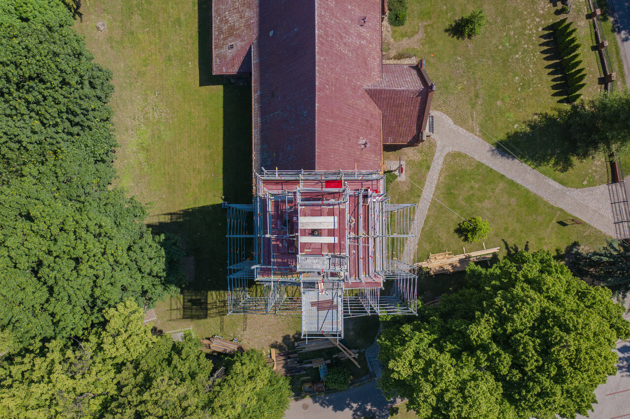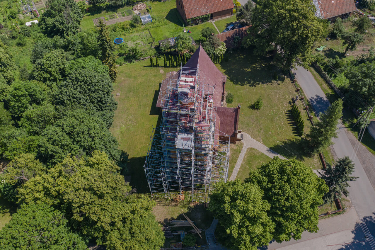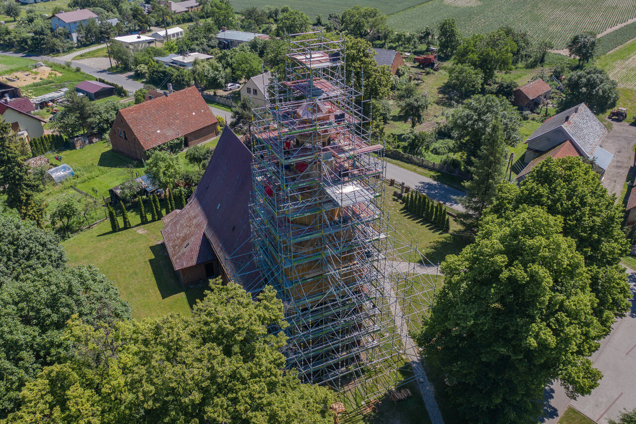 Realizacja na kościele w miejscowości Dobra zbudowana jest w oparciu o rusztowanie przestrzenne, inaczej modułowe. Z uwagi na brak możliwości kotwienia do elementów drewnianych kościoła, wystąpiła konieczność rozbudowy całej konstrukcji tak aby stała się konstrukcją samonośną.