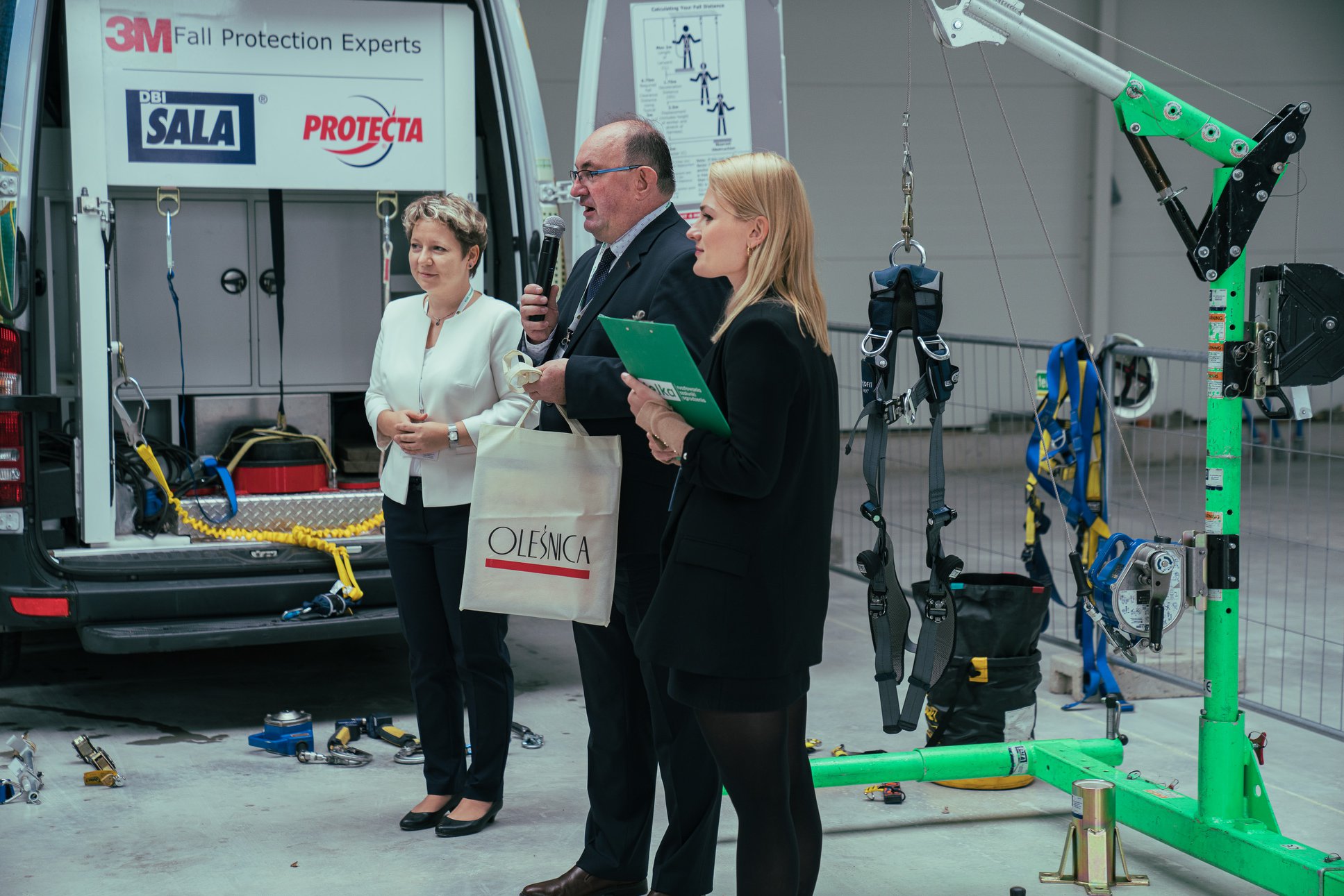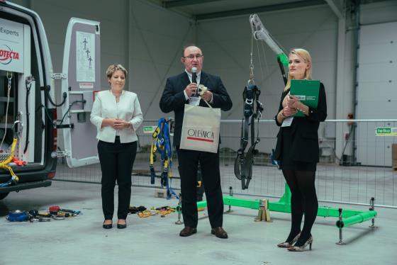 Pierwsza, pokazowa część forum odbyła się w naszej siedzibie. Mieliśmy zaszczyt gościć Burmistrza miasta Oleśnica Jana Bronsia, radnego Grzegorza Żyłę oraz lokalne media. Podczas tej części goście byli świadkami pokazów dotyczących bezpiecznej pracy na wysokości. Firma 3M udowodniła niezawodność swojego sprzętu na przykładzie naszego Pawła, natomiast firma GEDA zaprezentowała najnowsze rozwiązania dotyczące urządzeń transportu bliskiego i kotwienia, które ułatwiają pracę na rusztowaniach.